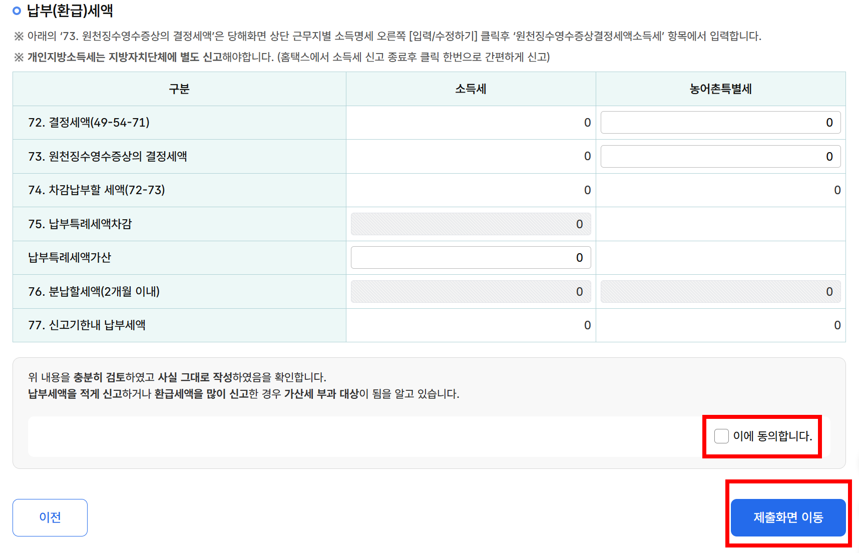 홈택스가 자동으로 계산한 납부세액 또는 환급 금액을 확인합니다.