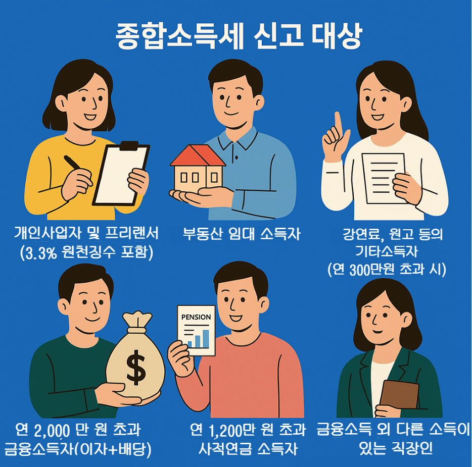 근로, 사업, 연금, 이자, 배당, 기타소득 등 다양한 소득이 이에 해당하며, 특히 프리랜서, 개인사업자, 다직장 근무자, 퇴직자는 반드시 신고 여부를 확인해야 합니다.