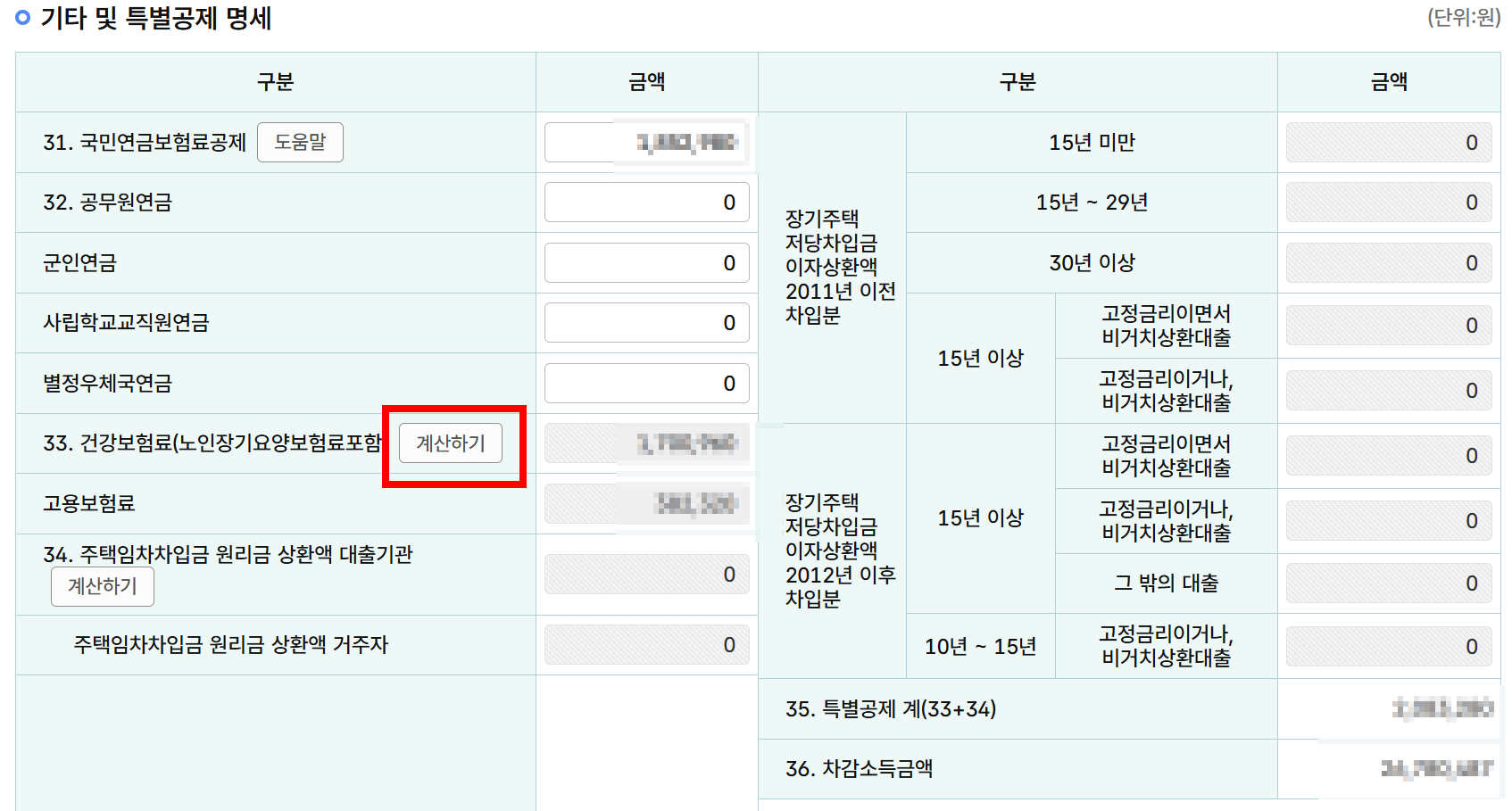 소득항목 및 공제 입력