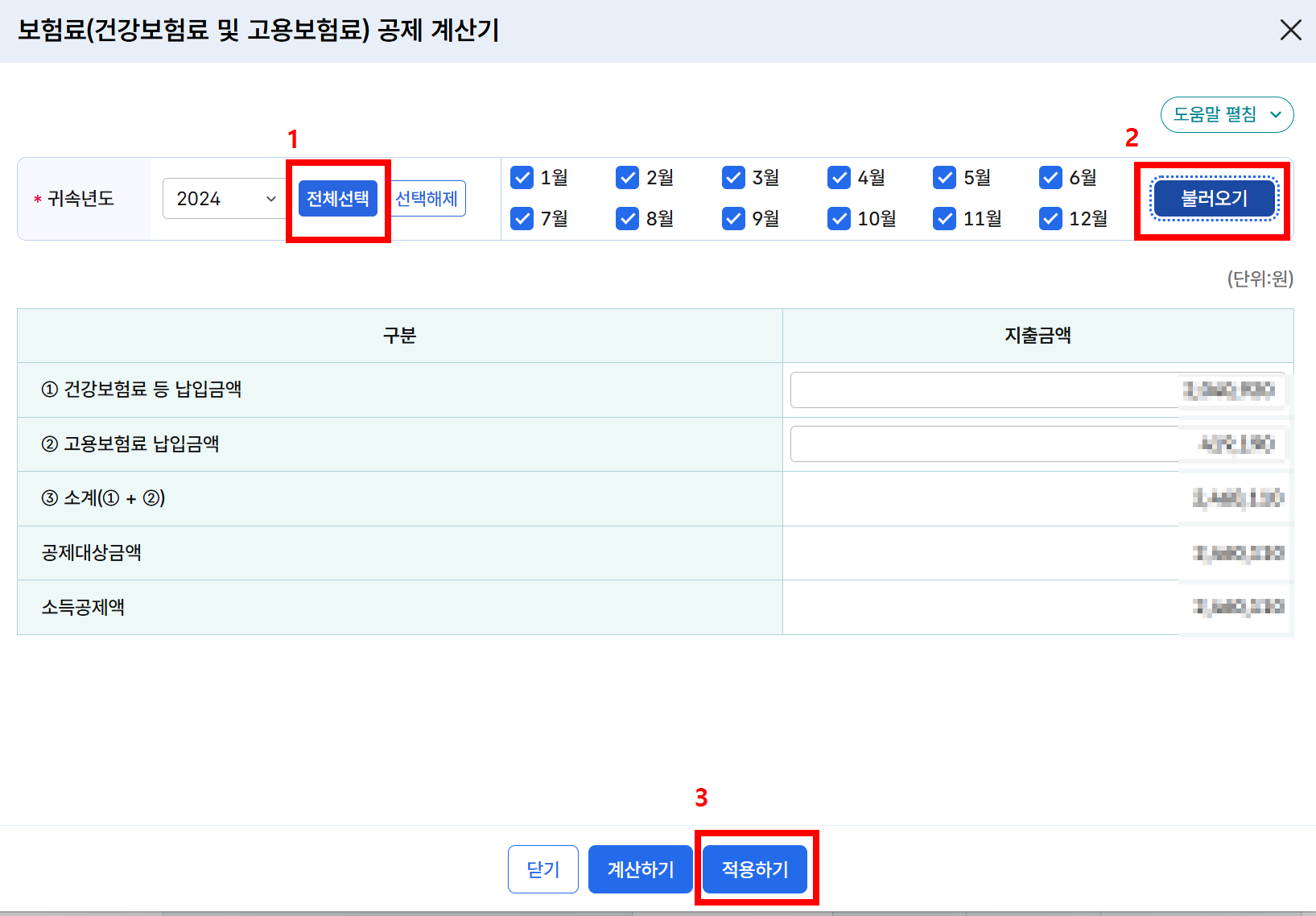 - 해당되는 항목 모두 계산하기 클릭 후 적용하기