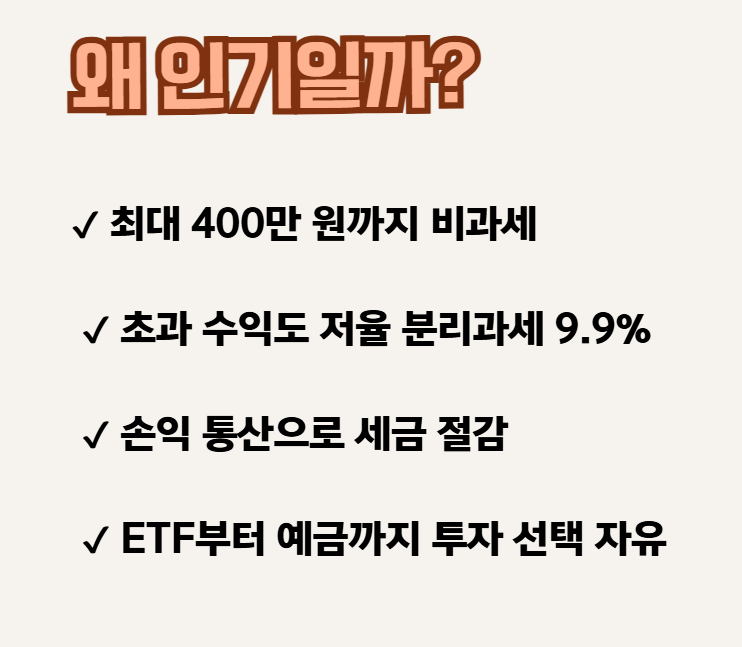특히 비과세 혜택과 저율 과세라는 절세 장점 덕분에 자산 증식을 목표로 하는 직장인·자영업자·초보 투자자들 사이에서 매우 인기인데요.