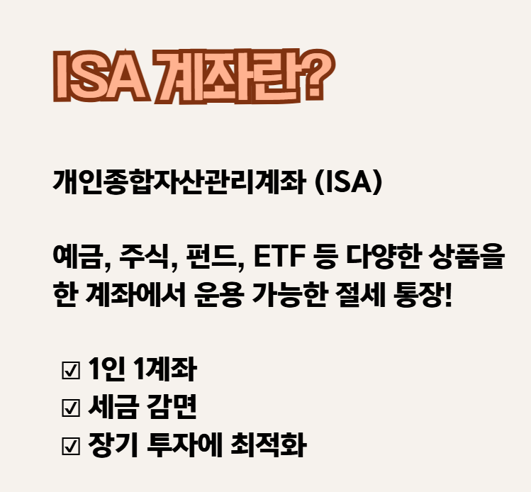 ISA 계좌는 쉽게 말해 **‘세금 혜택이 있는 투자 전용 장바구니 계좌’**입니다.